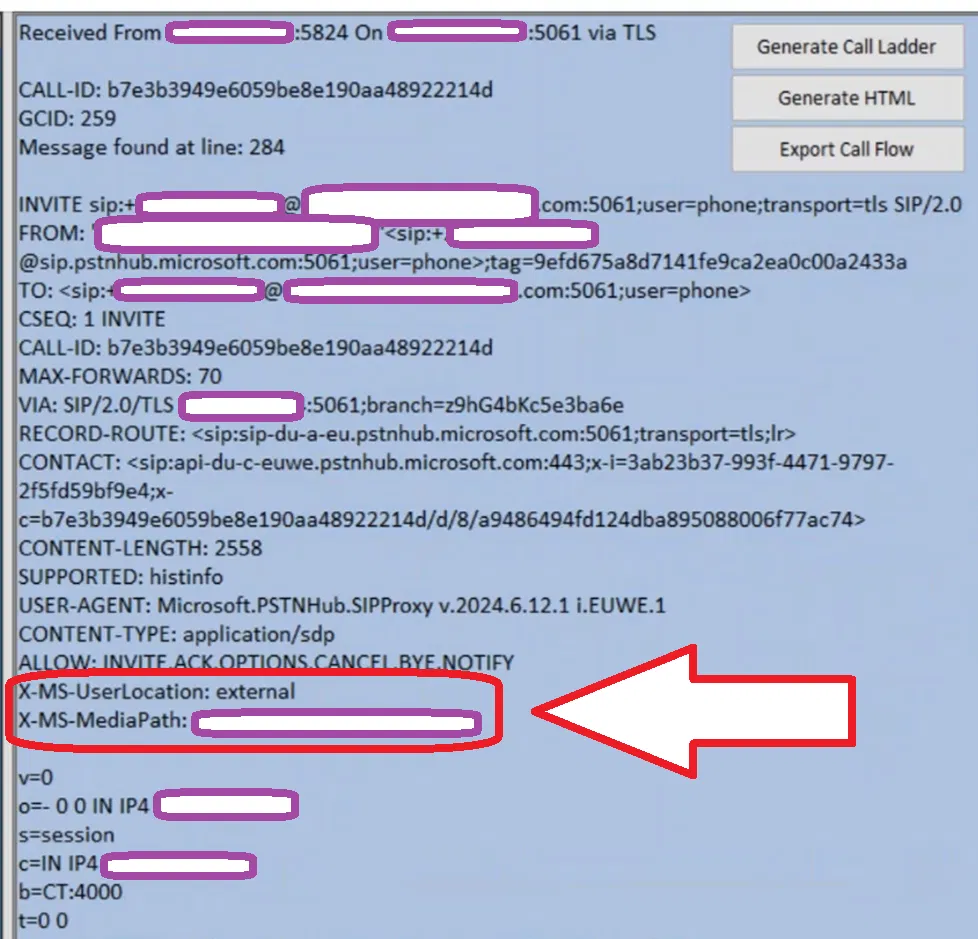 The image below shows the invite message between Teams Client and Ribbon SBC 1000 captured using the LX tool (Ribbon tool to capture Syslog we discussed above). The headers mentioned above are in a red box.