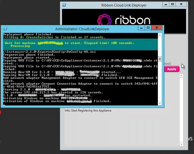 At this is step will run the deployer. Which will build the actual VMs of CCE. This process might take a few hours and it depends on the speed of the internet. Remember that the Windows Hyper-V Host need to access the internet on port 80 and 443 and also needs to access DNS as mentioned in the section “Firewall Ports and Settings”.
